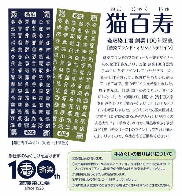 創業100年を記念して誕生した斎染オリジナル手ぬぐいです。100個ある「寿」の文字に猫さんが「こんにちは」しています。