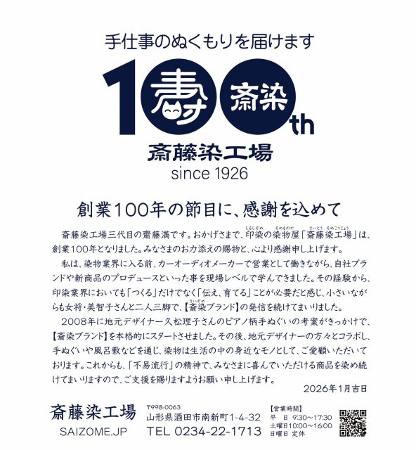 紺色と抹茶色の選べる2色展開の手捺染本染め手ぬぐいです。斎染のブランドプロデューサー久松理子さん渾身のデザインです。記念のしおりを作って頂いたので、ご覧になって下さい。