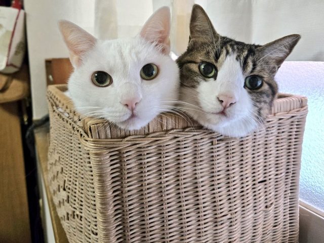 ところでウチの染め猫「しろさん&くろさん」は15年前、突然工場に居ました。お母さんが迎えに来ず、現在まで一緒に暮らしています。