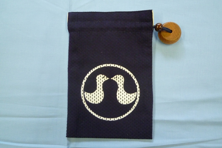 神輿会の巾着です。紺色に生地を染め、ロゴマークを白抜きました。