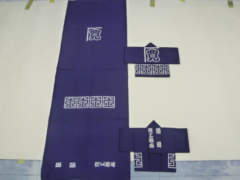 手ぬぐいを広げると「こー」なります。たたみ方を知りたい方は、ウチのミチコさんにご連絡下さい。親切丁寧に教えてくれると思います。「大紋」「腰柄」「襟文字」 こんな感じに文字が配置されてるんです。