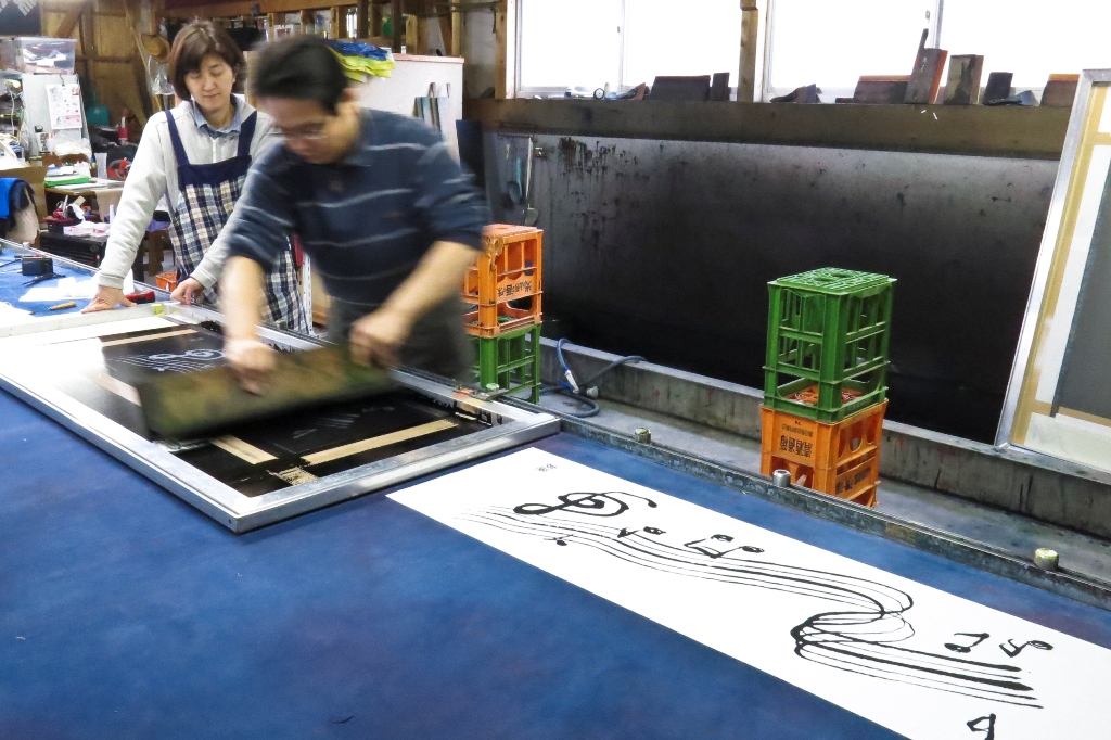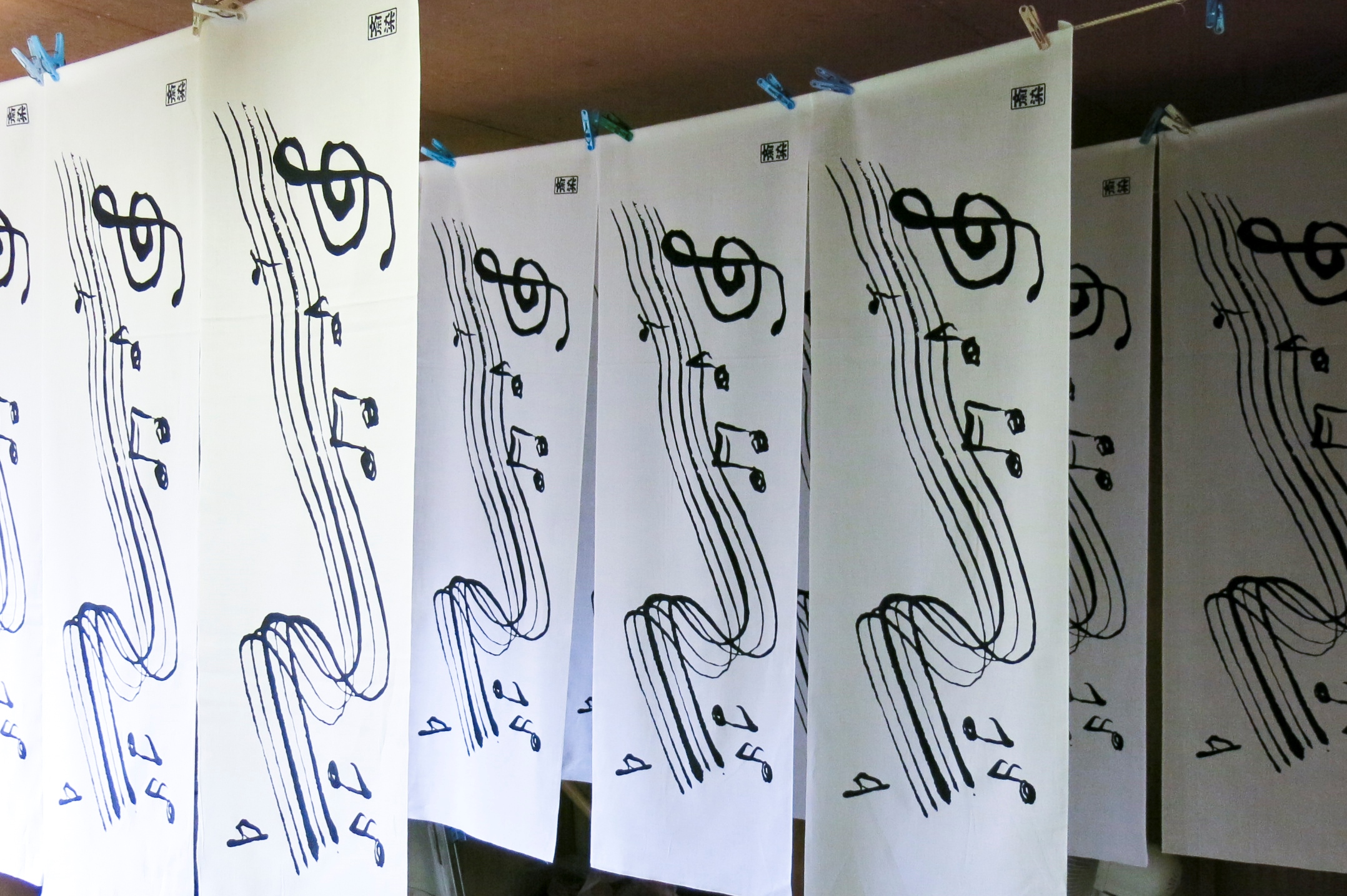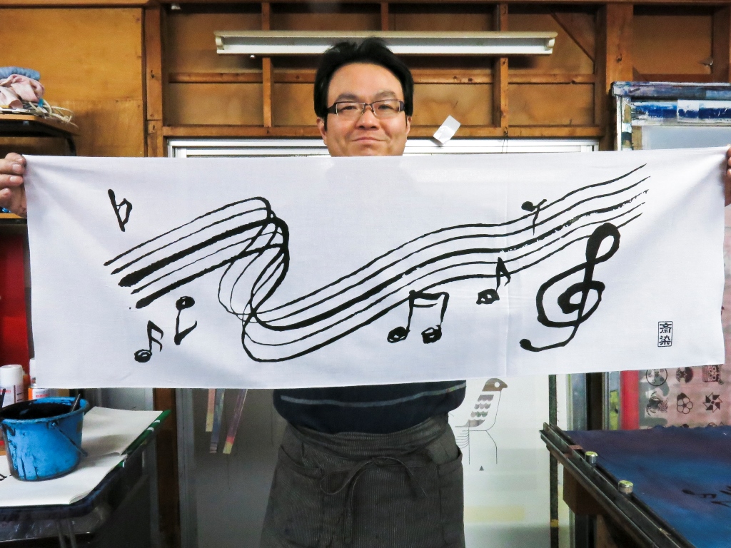 先日 斎染ピアノ柄シリーズプロデュース 久松理子さん 立会いのもと 斎染×Rico の新作手ぬぐい「楽譜柄手ぬぐい」のサンプルを染めました。今回の「楽譜柄」も久松さんプ