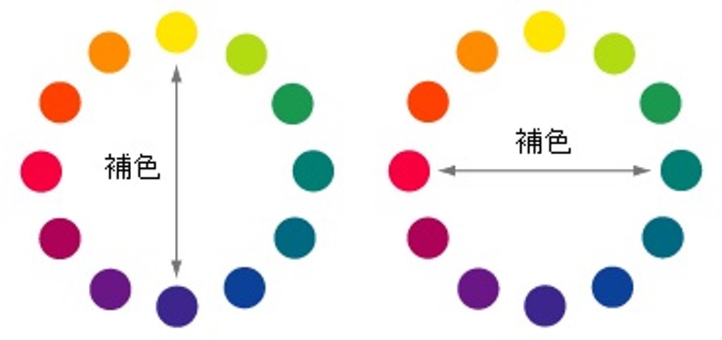 色相環の反対側に位置する二色を補色と言います。反対色という言葉の方が聞きなれているかもしれません。
