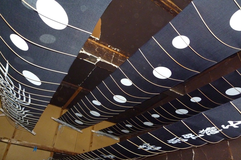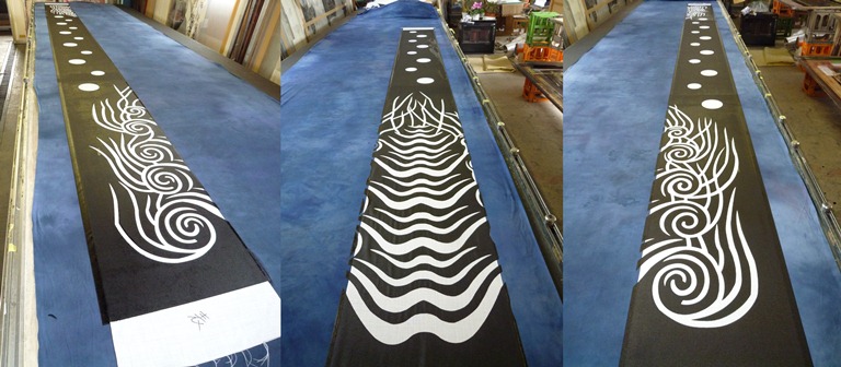 この写真は獅子幕の本体部分です。この3枚をうまいことつなぎ合わせてひとつの柄になります。