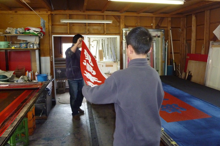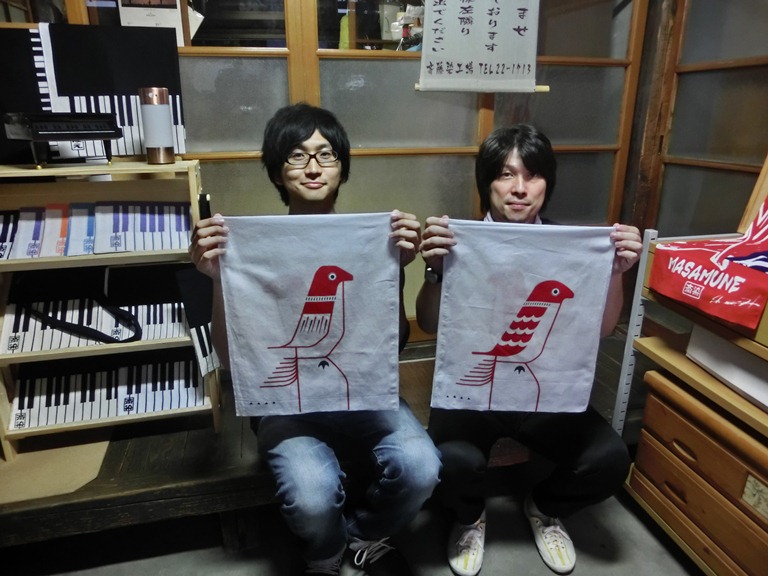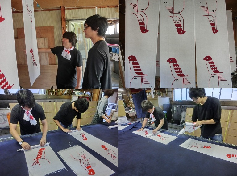 萩原社長(下写真・左)がデザインした「お鷹ぽっぽ手ぬぐい」 型作り、染め、色止め、洗い作業、乾燥仕上げ、ひと通り体験して頂きました。お疲れ様でございました。
