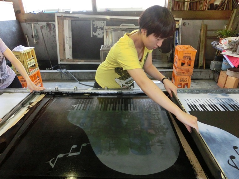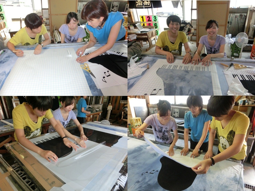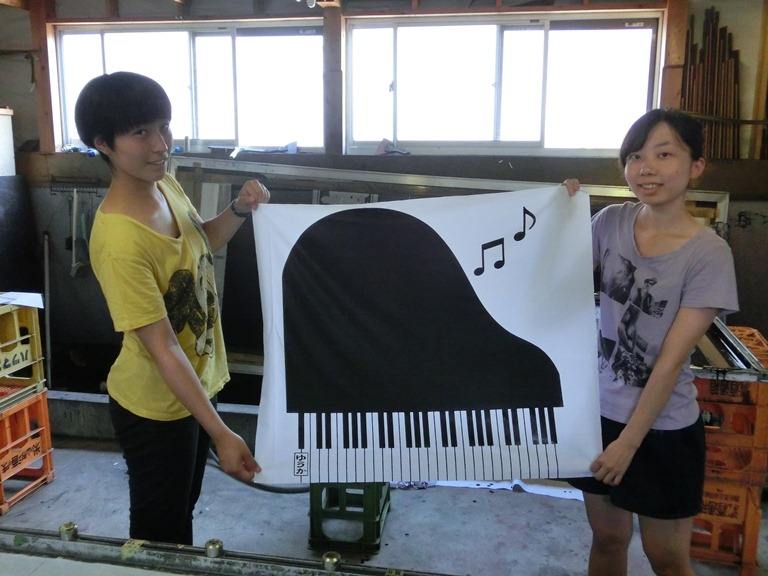 夏休み酒田に帰省しいる女子大生2人が「染め体験」ということでいらっしゃいました。とても可愛らしいお嬢さんたちです。小学生の工場見学とは違った趣向でやらなきゃなということで パソコンを使用して仕事してんだよ~とか言って実際やって見せ、次に型作って、貼って、あと最後に染めてみよ~ ってとこまでやりました。お客さんとボクの「時間と気分」がシンクロできれば、これからもしていきたいなぁ~と思います。