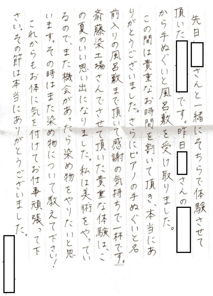 お二人とも お忙しい中 わざわざ送って頂き本当にありがとうございます。でもね ボクもいい経験、勉強をさせて頂いたんですよ。そして染物を少しでも知って頂くことは非常に有難いことなんですよ。体験だけど真剣に取り組んでくれて本当にありがとう。また遊びに来て下さい。
