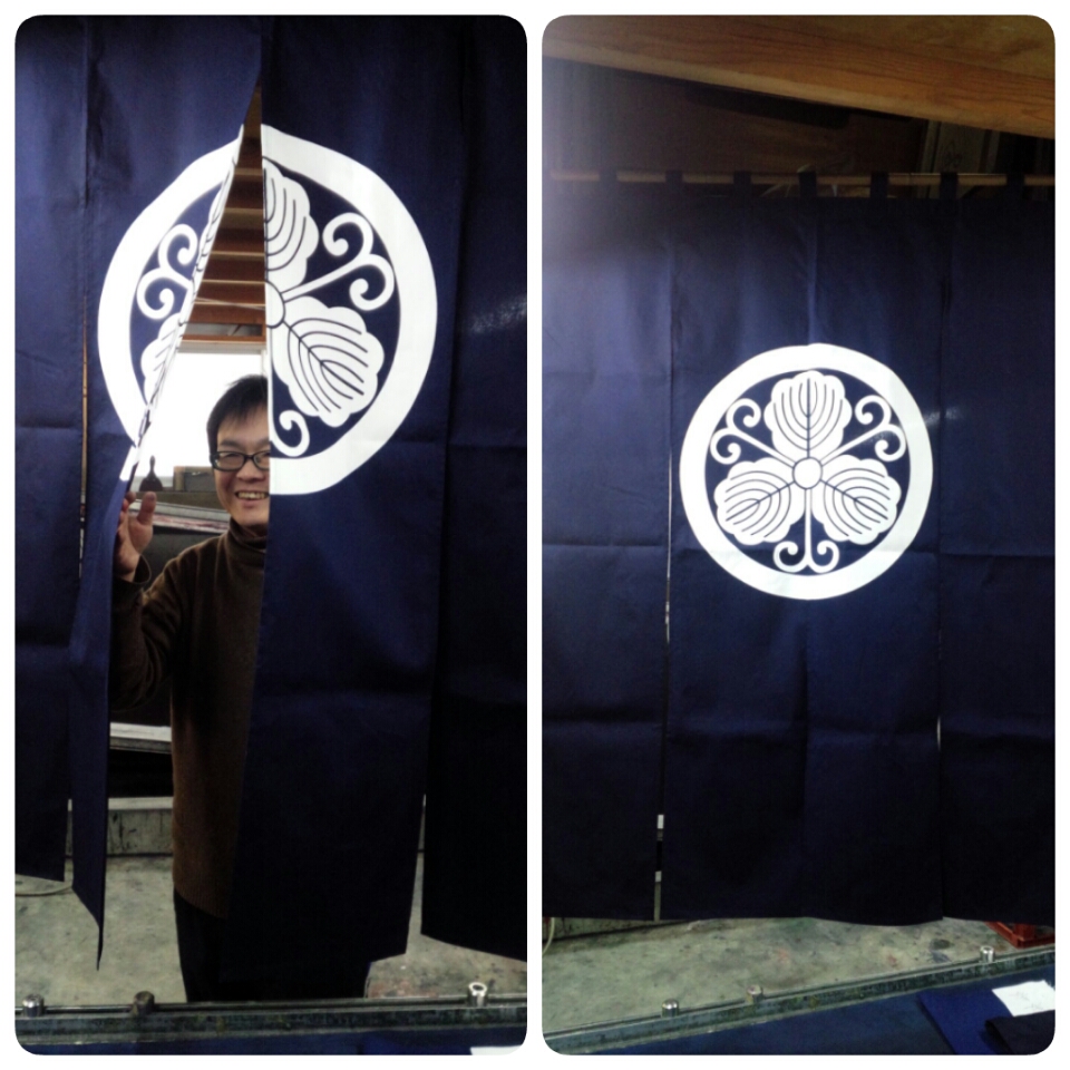 のれんを染めました。「丸に蔓柏紋」入りです。 サイズw136cm×h150cm 綿シャーク。