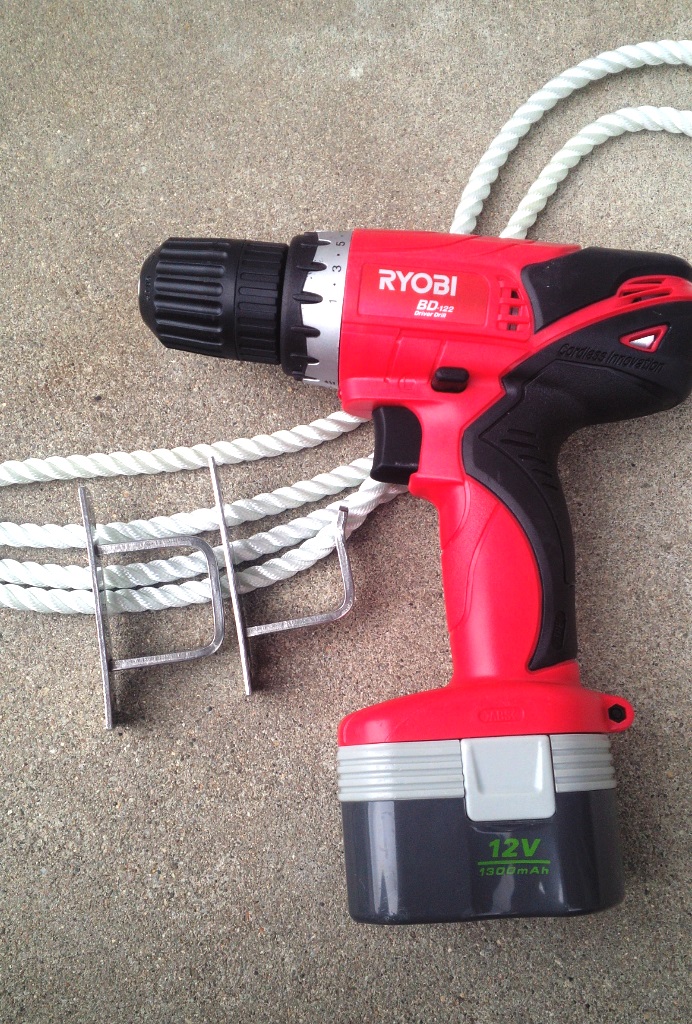 フックを取り付ける際の必須ツールです。電ドラはとても重宝します。日除け上下に通してある横棒は直径20mm程度の竹竿です。