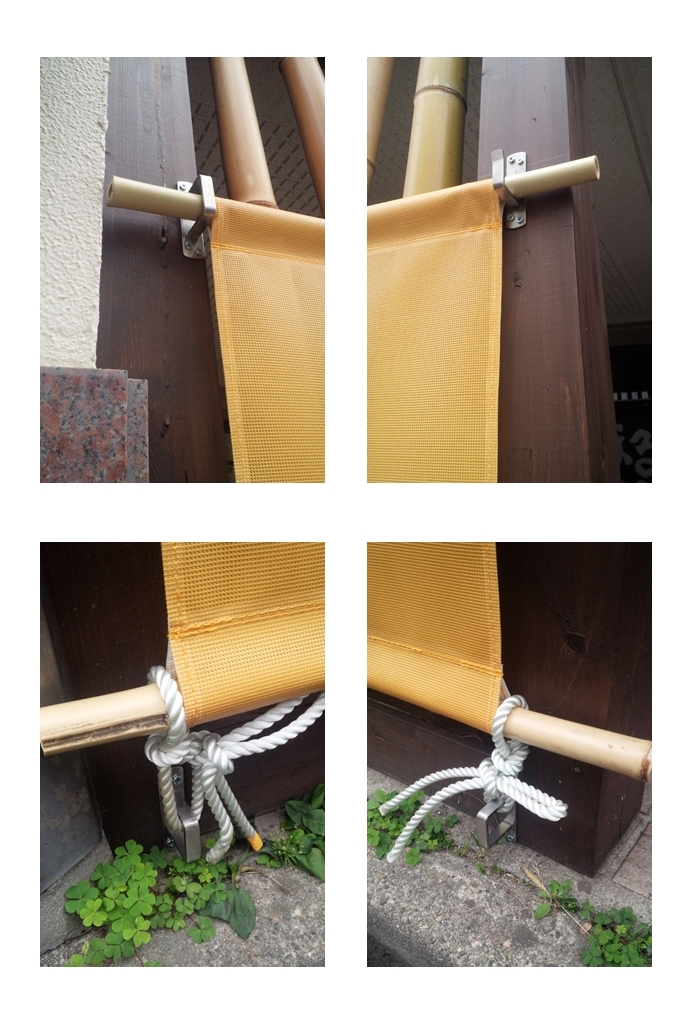 今回、納めた日除けは設置までしました。フックをビス止めできる柱(木材)が丁度よくあったので、市販されているモノを使用しました。私は木工事の素人ですが、見栄えにこだわりがなければこのように取り付けし、低コストでご提供致します。日除け下部分の固定は太さ10mmくらいの化繊ロープを使い、フックに結び、しっかり固定します。フックは上下2箇所ずつ、両はじへの取付けです。