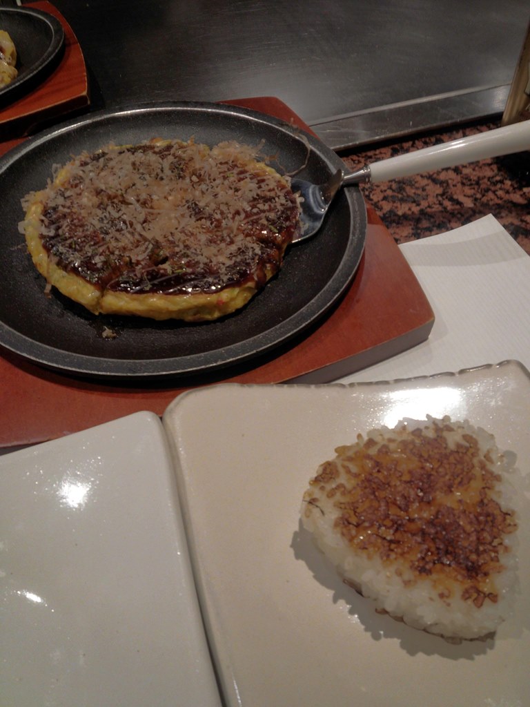 お好み焼き、焼きおにぎり。その他、とん平焼き、サラダ、 デザート。