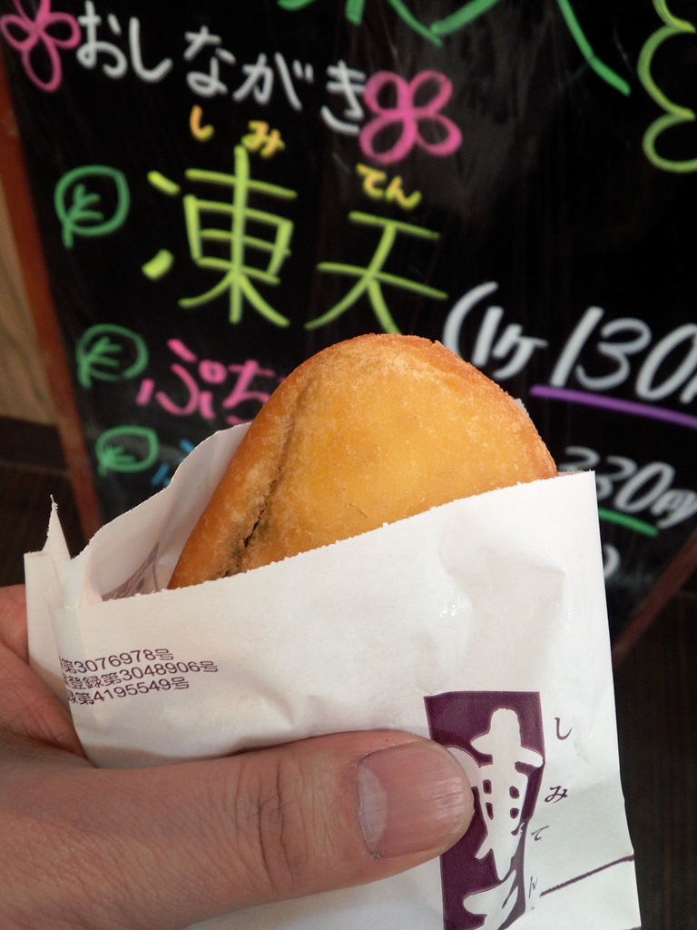 凍天・しみてん 保存食として食べられている凍み餅を水でもどし、ドーナツ生地でくるんで油で揚げて作ったモノ。