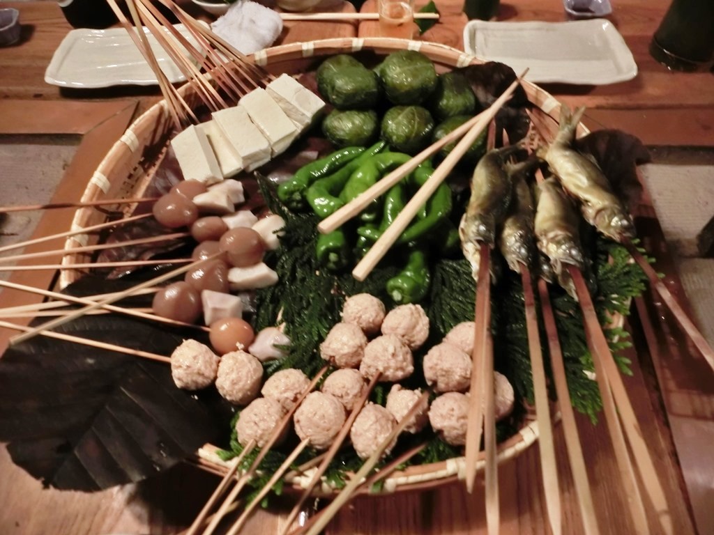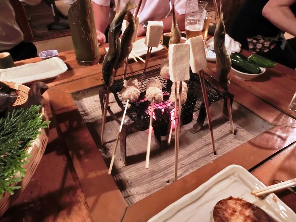 うぉー ゴージャス!! (⌒▽⌒) とうふ、鮎、ししとう、おにぎり、里芋&こんにゃく、そして写真はありませんが一口サイズの牛肉を頂きました。