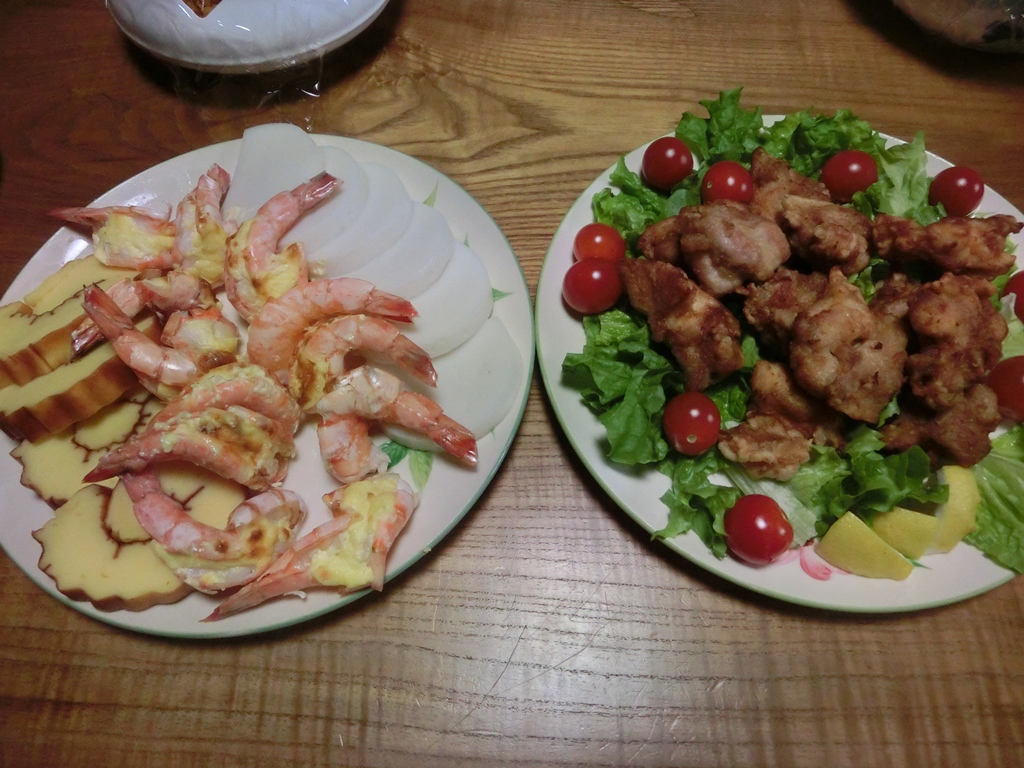オードブルその2 鳥の唐揚げ エビマヨ・チーズ焼き。