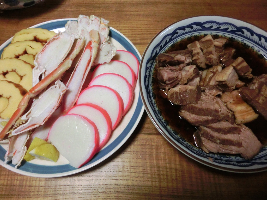 オードブルその1 蒲徳さんの蒲鉾 だて巻き ズワイガニ 煮豚。