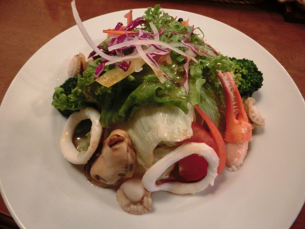 なぜか衝動的にシーフードサラダが食べたくなった。レストランでサラダをオーダーしたのはいつ以来だろう。カラダに気を使うようになった証拠か? 800円代の価格に高いと思いつつ、サラダは家で食べるべきと、改めて思った次第である。