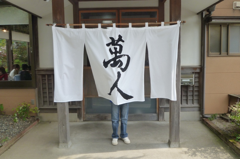のれんでお世話になりました庄内町の「萬人・まんにん」さんへ。風が強くてのれんが舞い上がるので、ユージから押さえてもらい撮影。サイズ:W2m×H1m20cm、生地:綿カツラギ、染料は顔料をブレンドした黒です。