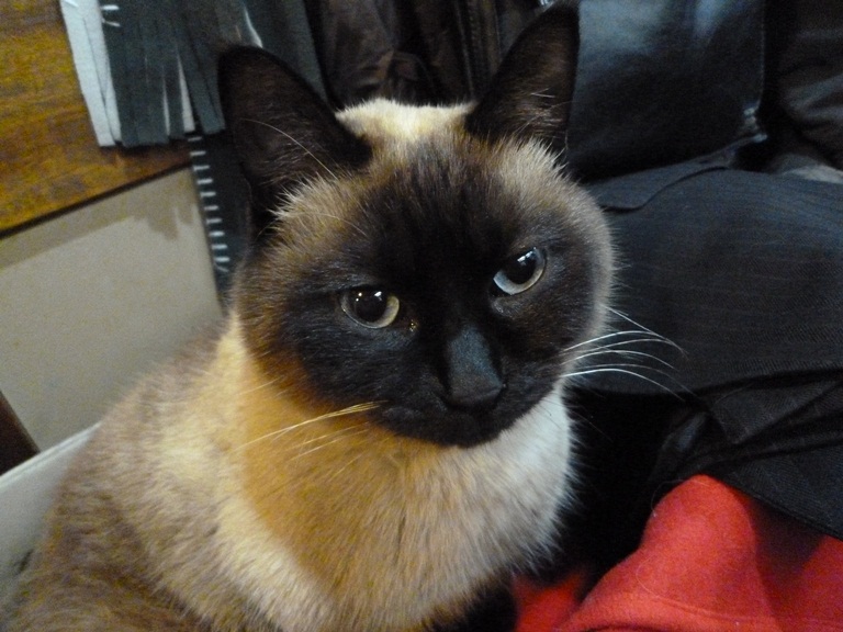 こちらのネコちゃんはお店の「招きネコ・くーちゃん」実にりりしいお顔立ち。斎染さんに無理やりだっこされても慌てることがない胆が据わった男子である。
