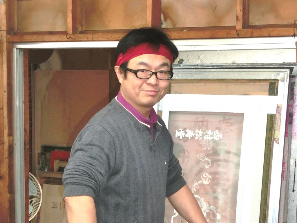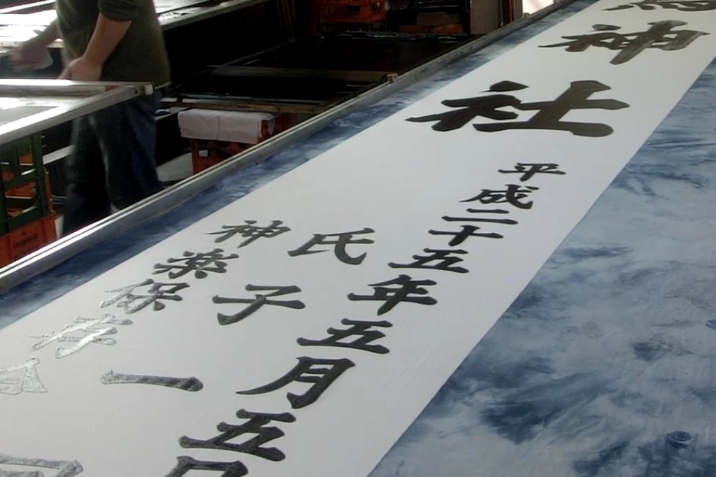 仕事は春を先取りして神社の幟を染めてます。
